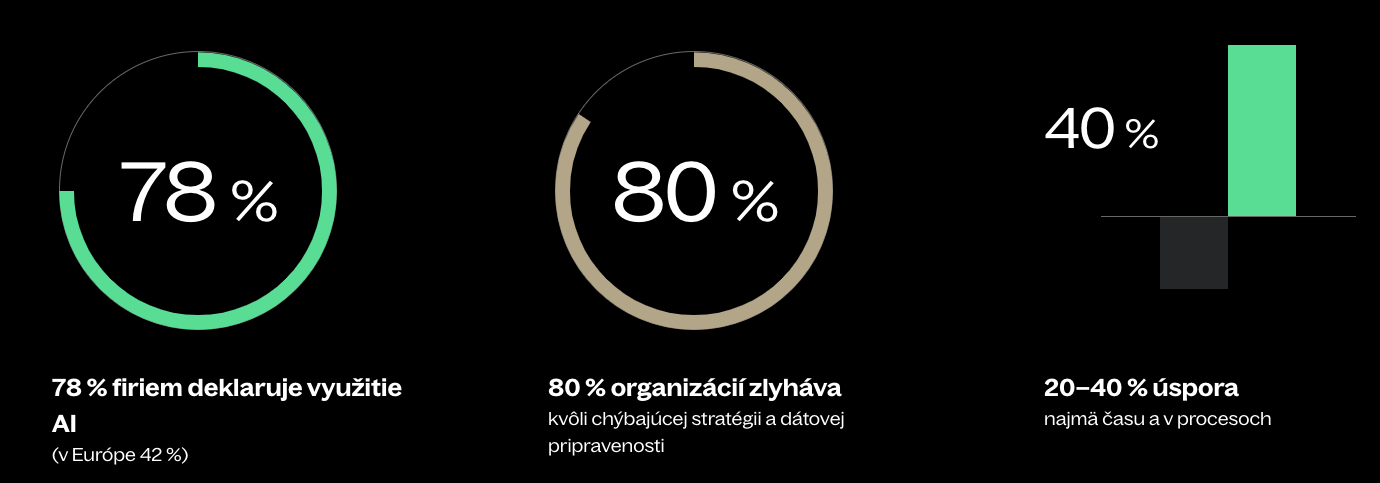 V globálnom prieskume z konca minulého roka uvádza štúdia od McKinsey že až 88 % respondentov tvrdí, že ich organizácia pravidelne používa AI aspoň v jednej biznis funkcii. Dáta zároveň ukazujú, že menej než tretina organizácií dodržiava odporúčané praktiky pre adopciu a škálovanie AI a len menej než jedna pätina sleduje konkrétne KPI. To však znamená, že v čase, keď úspešné spoločnosti začínajú merať návrantosť investícií, mnohé značky naopak naďalej experimentujú s AI nástrojmi bez riadeného procesu.