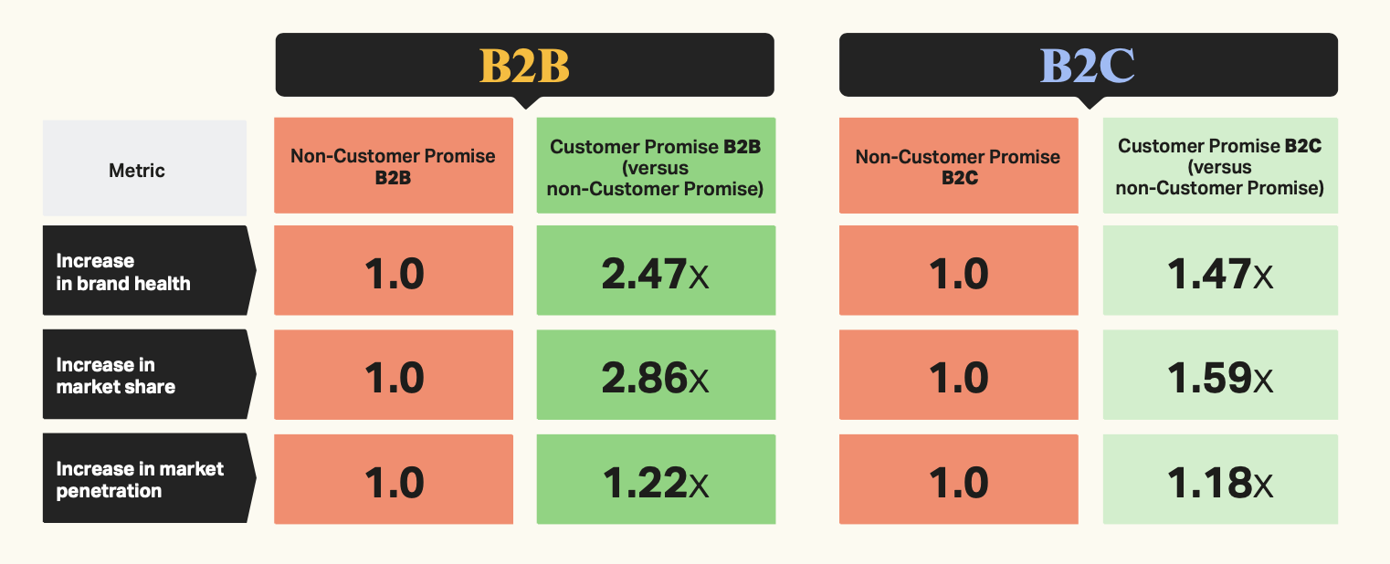 Dáta odhaľujú, že kampane a samotná komunikácia B2B značiek, ktoré obsahujú emocionálnu rovinu a customer promise (jasný, jednoduchý a priamo vyslovený prísľub hodnoty, ktorú značka dáva zákazníkovi), sú takmer 2,5 násobne účinnejšie v budovaní povedomia o značke a takmer 3 násobne zvyšujú pravdepodobnosť nárastu market share-u. Napriek tomu, podľa WARC Research & Advisory len 18 % B2B kampaní pracuje s týmito poznatkami v marketingovej komunikácii.